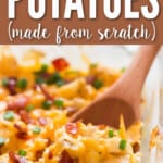 This recipe is made from fresh potatoes and I can assure you it tastes ridiculously delicious. The combination of ingredients with potatoes is addicting. Using fresh potatoes instead of frozen hash browns does not compromise on taste. You’ll have a few extra prep work to do, but the result is irresistible potatoes!
