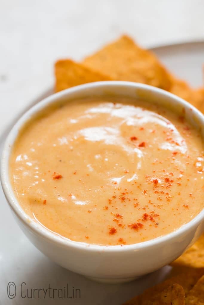 The spicy nacho cheese sauce is super easy to make. A bowl of silky smooth, cheesy, sauce is perfect for a dip, nacho cheese, with fries, steamed or roasted broccoli, mac and cheese sauce, as a dipping sauce for pretzel bites and so much more.